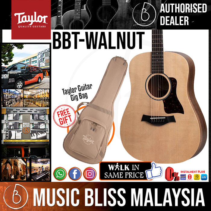 Our ever-popular Big Baby model receives a tonewood update this year, as we’ve shifted to layered walnut for the back and sides with a solid spruce top. Walnut brings a warm visual hue to the guitar’s aesthetic while the solid top powers vibrant acoustic tone, making this a great choice for players of all skill levels. It ships with a Taylor gig bag.
