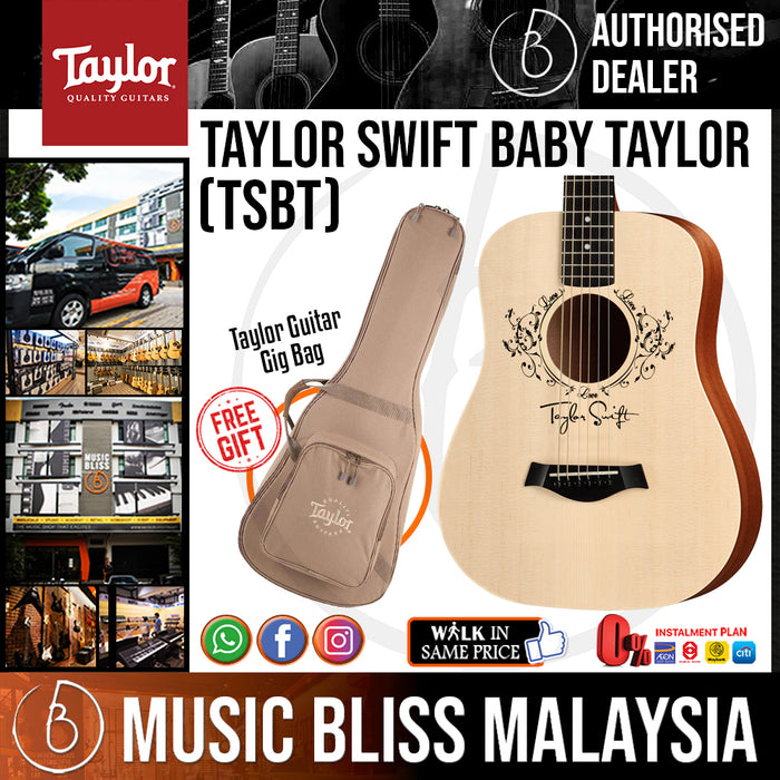 Taylor Guitars and Taylor Swift have joined forces to create the Taylor Swift Baby Taylor. Inspired by Taylor's memories of writing songs on her Baby Taylor, this guitar features custom graphics, big tone, and great playability. A Sitka spruce top and layered sapele back and sides give this guitar a tone that transcends its size. The 3/4-size design is extremely comfortable and fun to play. Whether you are looking for a guitar to craft songs on or a great travel guitar, the Taylor Taylor Swift Baby Taylor is the perfect choice.