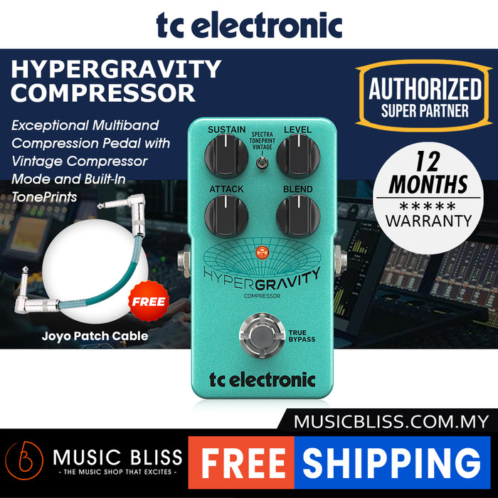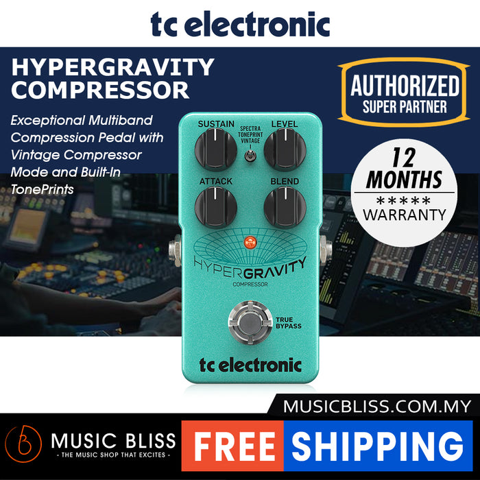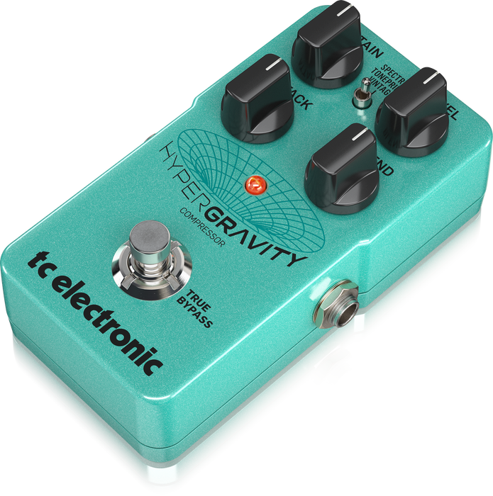 Add classic and modern compressors to your pedalboard with the TC Electronic HyperGravity Compressor pedal. The HyperGravity uses a highly advanced multiband dynamics algorithm from TC Electronic's System 6000, which has been the preferred dynamics tool for top producers for over 10 years. Choose between three compression tones including the ultra-transparent Spectra setting, the classic tight squash Vintage setting, or a customized TonePrint. Get the compressor sounds you want with TC Electronic's HyperGravity Compressor pedal.
