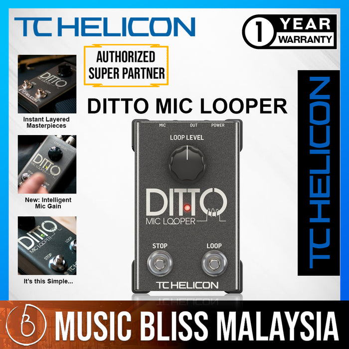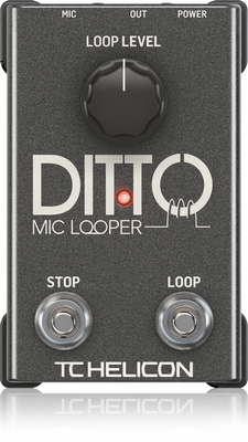 TC-Helicon's Ditto Mic Looper is a straightforward looper pedal for your vocal mic or any other instrument you mic up. Vocalists - use the stop/erase and loop buttons for unlimited overdubbing, undo, and redo features to add a deeper level of musical interest to your songs with just your voice by looping your own harmonies and vocal percussion tracks. Drummers and percussionists, use the Ditto Mic to keep the beat while adding flourish to your solos. And now guitar players who want the expressiveness only a pedal offers can harness the power of looping using their vintage acoustic guitars, banjos, and other instruments that aren't equipped with electronic outputs.