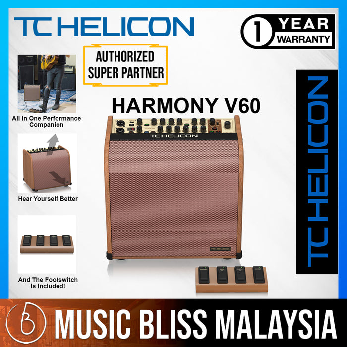 Hit the stage with TC-Helicon’s Harmony V60, and you’ll deliver the performance of your life. This 60-watt, 2-channel acoustic amplifier produces crystal-clear sound, by way of an 8-inch Tannoy speaker. What’s more, its exclusive top-firing tweeter projects the sound both at you AND at your audience. The V60’s voice channel is teeming with TC’s acclaimed vocal effects (including 2-part harmonies), and the guitar channel boasts a must-have cache of powerful sound-shaping tools as well. A built-in looper makes practicing and developing ideas a breeze, while also giving you a state-of-the-art performance enhancer. Dual XLR DI jacks with flexible routing put you firmly in the driver’s seat, while a USB output makes direct recording a piece of cake. You also get a dedicated aux input for media players, drum machines, and more. A convenient 4-button footswitch rounds out the TC-Helicon Harmony V60’s robust feature set.