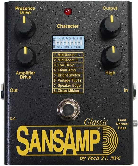Nothing beats the classics, and the Tech 21 SansAmp Classic pedal is back to prove this age-old proverb. A faithful re-creation of the original 1989 SansAmp Classic, this reissued version delivers full-force tones from many coveted tube amps in a compact, easy-to-use enclosure. It all starts with the 3-position Input switch, giving you distinct preamp options for Lead (similar to a hot-rodded Marshall), Normal (for a Mesa/Boogie-style sound), and Bass (much like a classic Fender amp). Once you choose your preamp, the real magic begins with a choice between SansAmp Classic's eight incredibly versatile Character DIP switches for fine-tuning things like tonality, harmonics, and dynamics. Music Bliss guitarists find these numbered switches incredibly useful when shaping their sound, with convenient labels to get you started. Need some shimmering highs and added clarity? Toggle on the Clean Amp switch for instant access. Want to experiment with different mic placements? Switches for Speaker Edge and Close Miking settings will help you nail the sound you are seeking. For even greater variety, Presence Drive and Amplifier Drive controls let you shape the contours of the preamp and power amp, respectively, with a High control for final tweaks to the EQ. Whether a mainstay in your rig or a handy tool for the studio, the SansAmp Classic is a valuable addition to your sonic arsenal.
