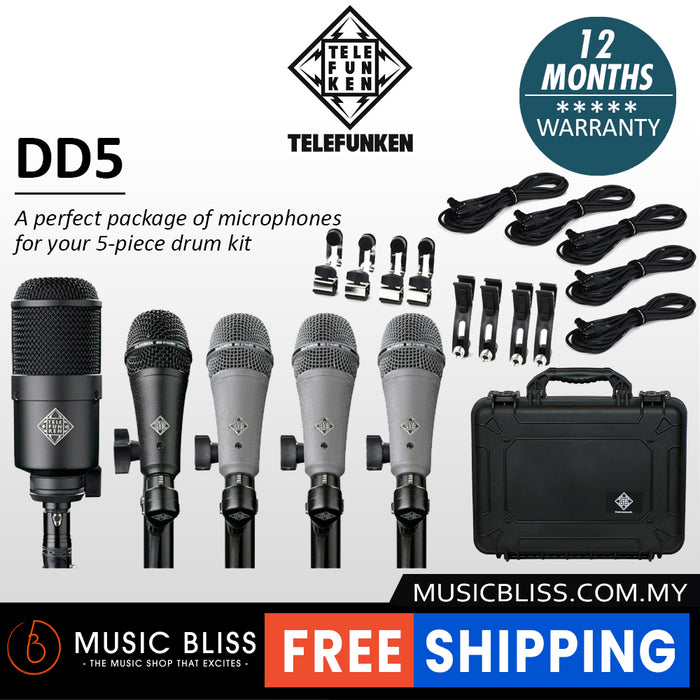 If you need to mic up a drum kit, then Telefunken has the microphone pack for you: the DD5 Drum Microphone Set. The DD5 Drum Microphone Set comes with five of the most popular Telefunken dynamic drum microphones you'll find at Music Bliss, including an M82 kick drum mic, a M80-SH for your snare drum, and a trio of M81-SH microphones that bring out the best in your toms. In addition to these wonderful microphones, you also get a set of five XLR cables to go with them. Each of these cables has a right-angle female connector, which makes mic placement easy. Top it all off with a flight case, and you're ready to take your DD5 Drum Microphone Set anywhere.