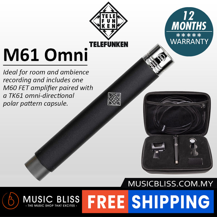 Telefunken microphones have long been a recording industry standard. Now they fill an even larger space in the studio world with their first non-tube small diaphragm condenser microphones, like the M61 FET! The omni-directional pattern and a flat EQ response between 20Hz to 5kHz with an airy peak at 8kHz makes the M61 perfect for applications where capturing the ambience around your instrument is what you're after. Music Bliss engineers know that the famous Telefunken diamond badge on the body of the Telefunken M61 FET means that you can record confidently with one of the best in the game.