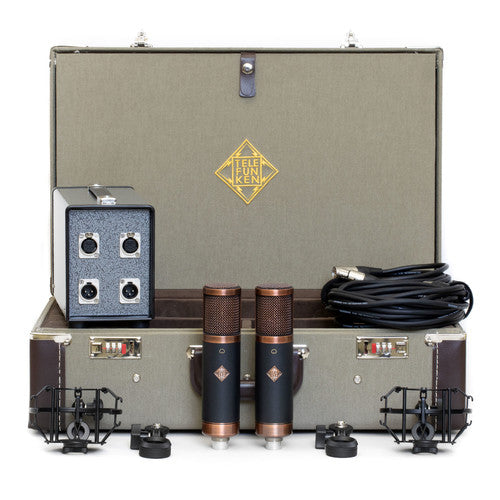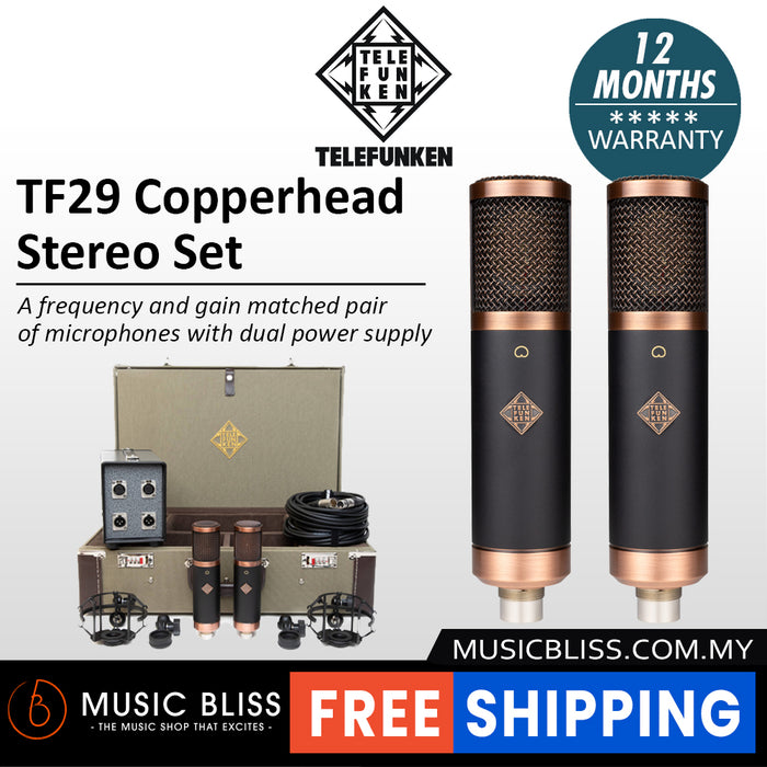 This pair of Telefunken TF29 cardioid tube condenser microphones offers a balanced, natural tone with warm midrange frequencies, a rich low-end, and additional highs for presence and clarity. This workhorse mic is well suited for recording vocals, electric and acoustic guitar, brass, and other instruments and is also very effective as a room or overhead mic for drums. Part of Telefunken's Alchemy Series of large-diaphragm tube condenser mics, the TF29 mic's all-brass k67-style capsule, new old-stock American-made 5654W vacuum tube, and Swedish-made Lundahl output transformer give the mic it's distinctive, bold, and full "copperhead" sound. That signature sound features an approximate +4 dB boost in the 20 to 100 Hz range for added bottom while the high end is boosted by about 2 dB at around 13 kHz and 4.5 dB at approximately 18 kHz. The additional highs help to balance out the extended low end and keep the mic from sounding muddy.The TF29 features a cardioid polar pattern that focuses audio capture in front of the mic, great for a wide variety of applications. An external power supply, connecting cables, stand mounts, and shockmounts are included.