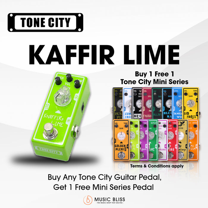 The Tone City Kaffir Lime is an overdrive/boost pedal based on that popular and familiar green stompbox, however with a few twists. Its mid-boosted character works amazingly well when running into an already driven amp, adding extra saturation and sustain.