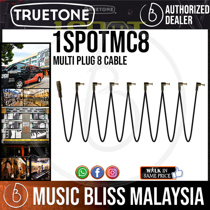 The Truetone 1 SPOT Multi Plug 8 Cable 8-plug daisy chain lets you power up to eight pedals with your 1 SPOT power adapter. Not only does the 1 SPOT Multi Plug 8 Cable offer handy right-angle plugs, you also get over 12" between plugs for convenient pedal placement. Spring-loaded contacts in the input sockets maintain secure connections, and you can even link multiple Multi Plug 8 Cables together to power more effects! When you want to get the most out of your 1 SPOT adapter, pick up the 1 Spot Multi Plug 8 Cable.