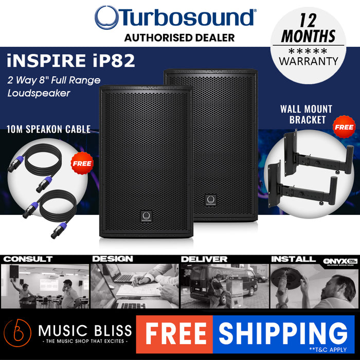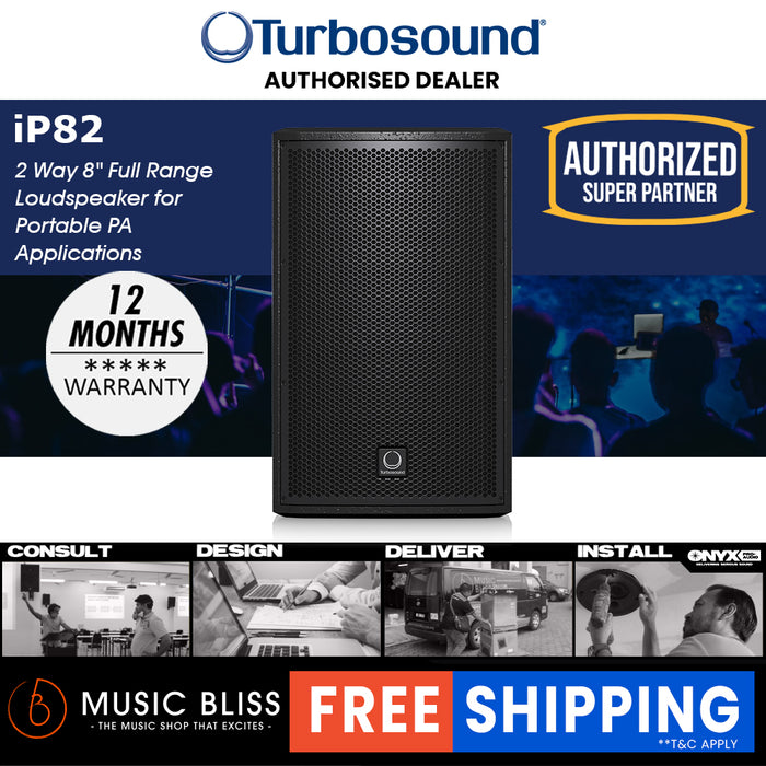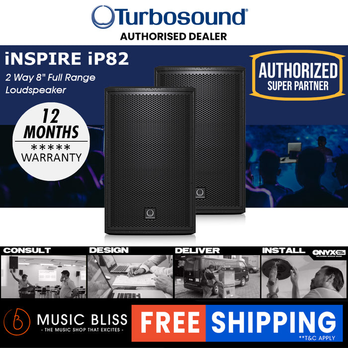Turbosound's iNSPIRE iP82 is a full-range 2-way passive PA speaker with an 8" woofer and a 1" dome compression driver tweeter that's perfect for small to medium-sized venues such as nightclubs, boardrooms, houses of worship, and more. The iP82's portability and attractive yet roadworthy design make it suitable for a wide range of music and speech sound reinforcement applications. Teamed up with Turbosound's iP12B or iP15B active subwoofers, the iP82 is an ideal choice for front of house satellite speakers. Music Bliss engineers have also found the Turbosound iNSPIRE iP82 to be highly effective for stage lip, balcony, sidefill, and delay line duties.