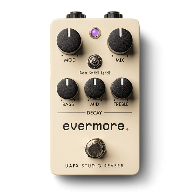 Boasting three studio-grade reverb algorithms from Universal Audio’s Golden Reverberator pedal, the Evermore Studio Reverb pedal provides a masterclass in studio-style digital echo. Evermore sports three voices to swap between — Room, Small Hall, and Large Hall — all inspired by the textured trails and moody modulation of an all-time great 1980s digital reverb unit. What’s more, Evermore comes complete with a positively compact and pedalboard-friendly enclosure, along with an array of straightforward controls, including a 3-band EQ, modulation knob, and Mix control. Lastly, it’s all topped off (quite literally) with two top-mounted switches for control over your signal’s pre-delay and whether the pedal operates in Trails mode or Bypass mode.