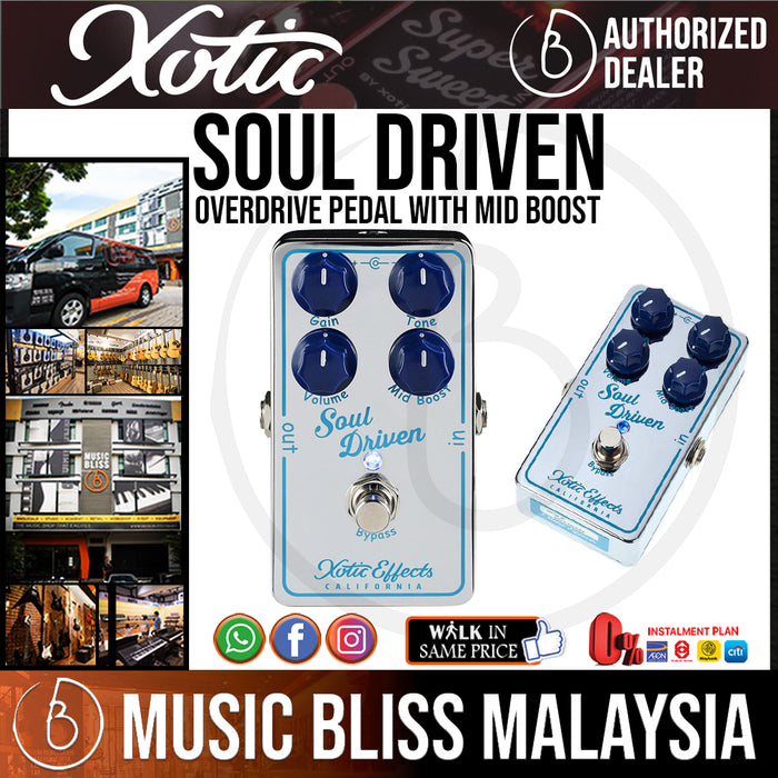 Xotic's Soul Driven overdrive pedal replicates the tone and response of a perfectly tuned amp, offering powerful control over your mid frequencies, fattening up your tone, while simultaneously punching through the mix. And the tone control adds clarity without ever becoming harsh at higher settings. Grab the Soul Driven and get ready for inspirational, authentic tube tone.