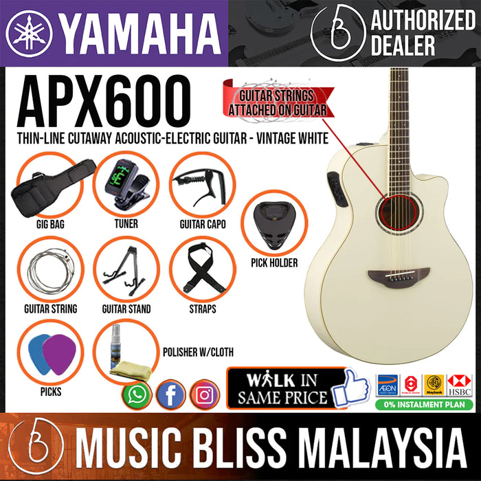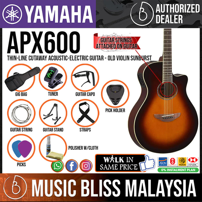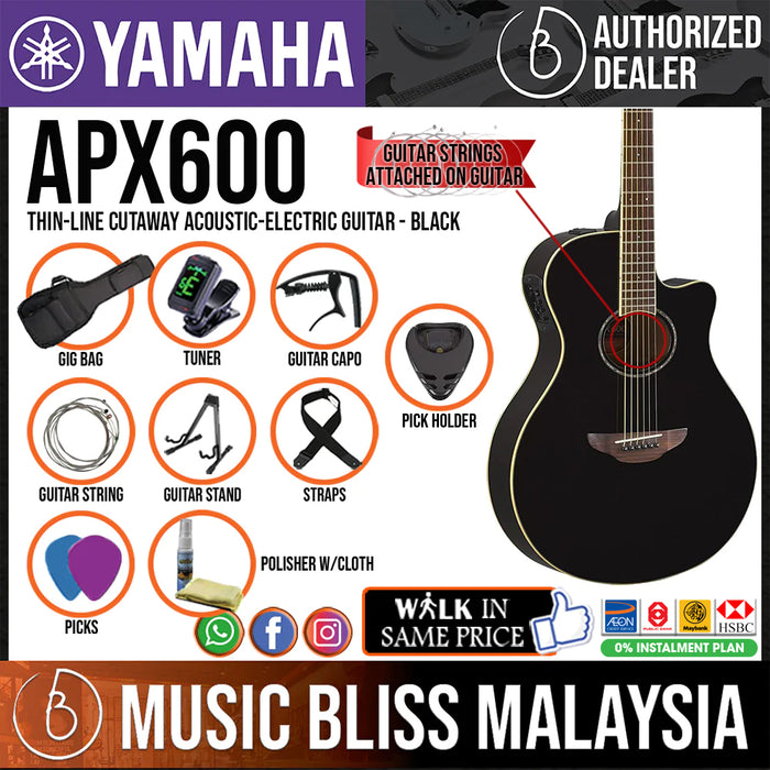 The Yamaha APX600 is another example of the high-quality craftsmanship and affordability that Yamaha is known for. The APX600 offers great sound, a smooth playing feel, and an eye-catching style at a great price. This thinline cutaway acoustic-electric features a built-in tuner and a System 65A preamp piezo pickup system, great for plugging in and playing coffeehouse gigs with natural acoustic sound that people will love. The spruce top and nato body help the Yamaha APX600 pump out great tone even when you're playing unplugged. Acoustic players here at Music Bliss love the APX600 for its affordability and great tone.