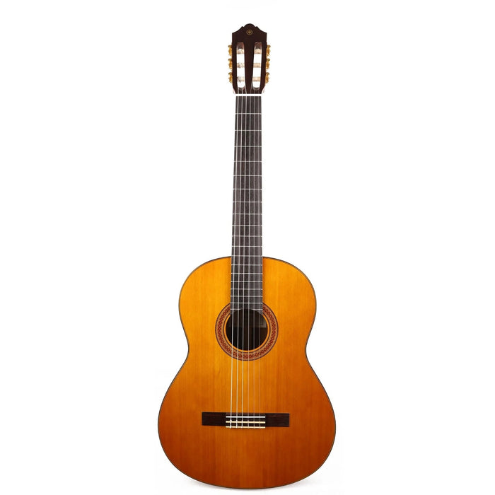 The Yamaha CG162C is a full-sized, nylon-string classical guitar featuring a solid American cedar top, ovangkol back and sides, and a gloss finish. Its bridge is fashioned out of rosewood, while its 25.6" scale nato neck is fitted with a rosewood fingerboard and a set of gold classical tuners with white pearloid buttons. It is designed to serve as a high-quality instrument for intermediate players.
