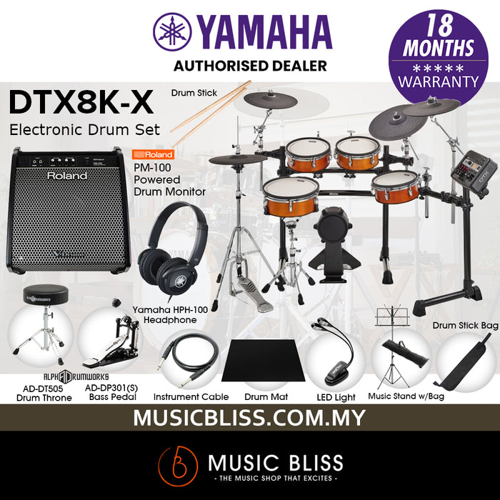 Yamaha DTX-8K-X Electronic Drum Set with Roland PM-100 Drum Monitor and Yamaha HPH-100 Headphone - Real Wood (DTX8 / DTX8K / DTX8KK / PM100 / HPH100)