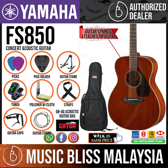 The FS Series FS850 from Yamaha is a full-size concert-style acoustic guitar made with a solid mahogany top, and mahogany back and sides with a natural finish. The compact FS body is 10mm slimmer than the larger dreadnought-style FG body, providing increased comfort with no loss of volume or bass. Well suited for solo performance or playing with a full band, the FS850 utilizes a newly developed scalloped bracing design, which results in a powerful and balanced acoustic sound with stronger lows and mids than its predecessors.