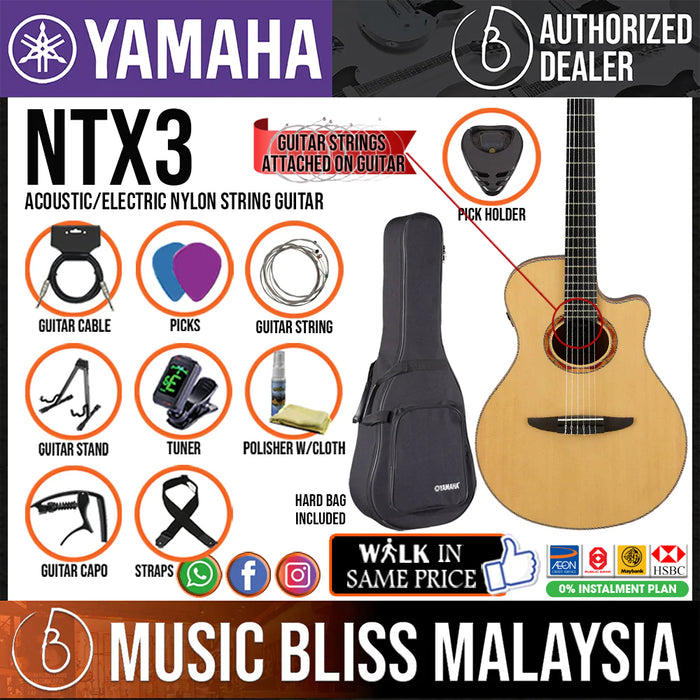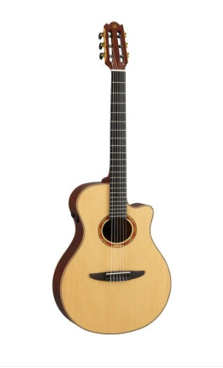 Steel string and electric players can all agree that switching to a nylon string isn't easy. In fact, it can be downright hard! To make the transition easier, Yamaha built the NTX3. This acoustic-electric has a low action and comfortably slim neck that makes playing easier than ever. You'll find it easy to fret complex chords and play lead lines. the cutaway body gives you complete access to the upper frets without having to awkwardly contort your hand. Made from all-solid tonewoods, this guitar displays a lively resonant quality and a sweet sustain. It's also equipped with Yamaha's Atmosfeel electronics that appeal to performers of all types. Whether you're a seasoned nylon player or making the switch from electric or steel strings, the Yamaha NTX3 is a great option.