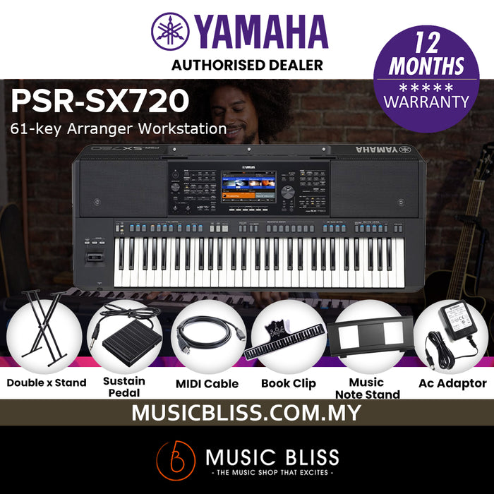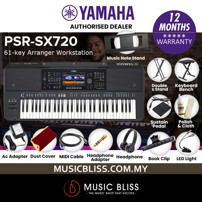 The Yamaha PSR-SX720 is a powerful professional arranger workstation that will ignite your creativity without torching your budget. With its intuitive color touchscreen and joystick controller, assignable real-time control knobs, 16-track song recorder, and studio-grade sound quality, the PSR-SX720 gives you maximum control with minimum effort, streamlining your creative flow and letting you capture your best ideas and recall them with the press of a button. From polished demos to finished masters, the Yamaha PSR-SX720 is an incredibly powerful creative tool. Whether you’re a songwriter, arranger, or performer, you owe it to yourself to check out what it can do for your music.