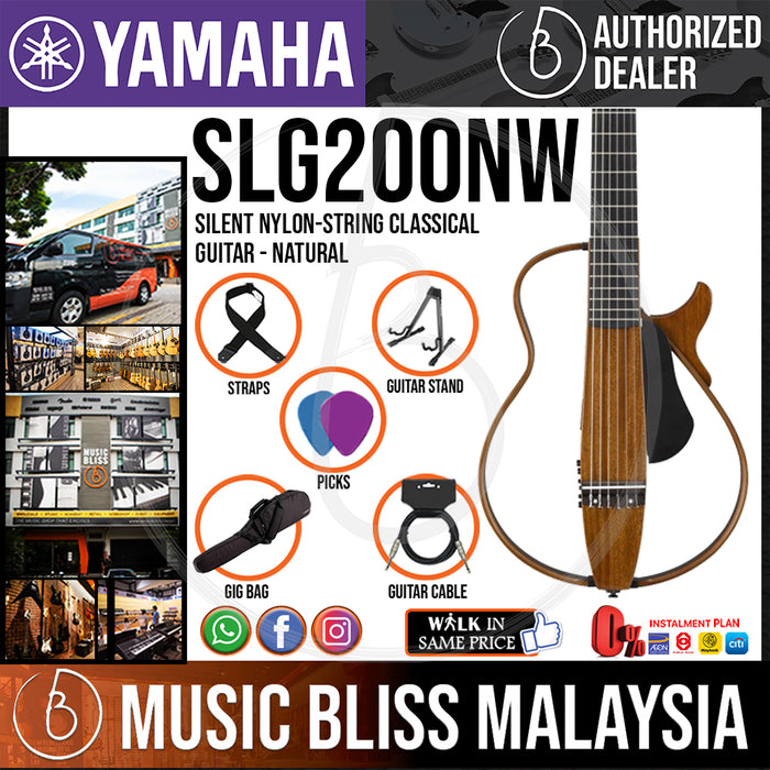 The SLG200NW is the latest in Yamaha's groundbreaking line of "silent" guitars; this version is designed just for classical guitarists. The 2-1/16" nut provides that classical guitar feel, and the guitar's top section detaches and stows in the included gig bag — making it fit easily in an overhead compartment. Convenient and yet authentic, this guitar exhibits Yamaha's SRT powered system, developed to reproduce the sounds of a high-end Yamaha acoustic guitar. You also get a built-in chromatic tuner, onboard effects, aux in, and headphone output. With its mahogany body and neck, rosewood frame, and ebony fingerboard, the Yamaha SLG200NW is as beautiful as it is functional and travel-ready.
