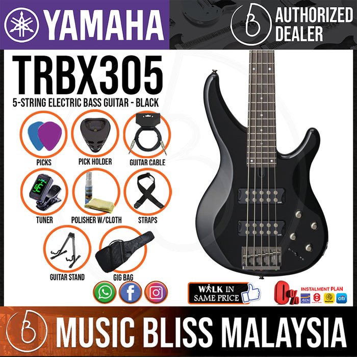 The Yamaha TRBX305 5-string bass guitar brings versatility, killer looks, and amazing performance together in a complete package. This sleek-looking, great-sounding bass gives you a comfortable Yamaha body shape and a fast-action bolt-on 5-piece maple/mahogany neck with a smooth-playing rosewood fingerboard. A pair of humbucking pickups deliver hum-free sound and the Performance EQ active circuit instantly optimizes your bass or different playing styles. Factor in the Yamaha TRBX305's solid hardware and thoughtful design, and you've got a great-looking bass that's ready to conquer any stage.