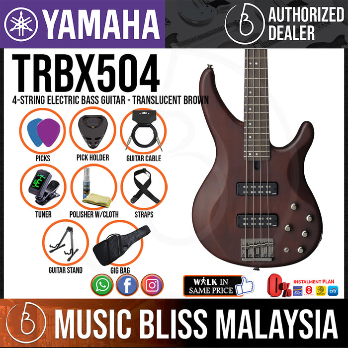 The Yamaha TRBX504 bass guitar brings versatility, killer looks, and amazing performance together in a complete package. This sleek-looking, great-sounding bass gives you a comfortable Yamaha body shape and a fast-action bolt-on 5-piece maple/mahogany neck with a smooth-playing rosewood fingerboard. A pair of humbucking pickups deliver hum-free sound and powerful active electronics lets you optimize your bass or different playing styles. Factor in the Yamaha TRBX504's solid hardware and thoughtful design, and you've got a great-looking bass that's ready to conquer any stage.