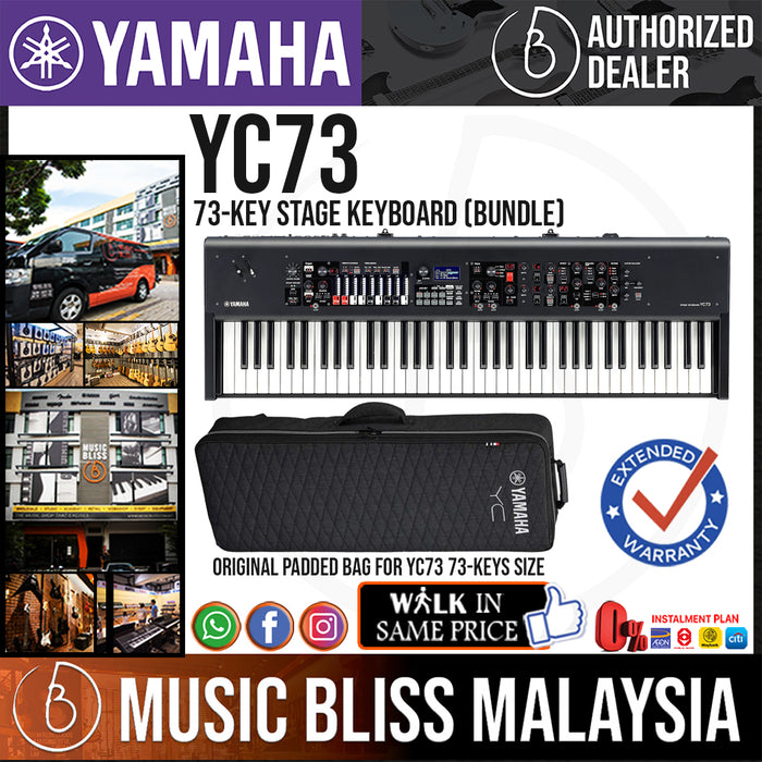The Yamaha YC73 packs expressive acoustic pianos and electric pianos, vintage combo organs; detailed instrument sounds such as strings, bass, and brass; and dynamic synth sounds into a gig-friendly and compact 73-key stage keyboard. Using Yamaha’s proprietary Virtual Circuitry Modeling, the YC73 is one of the most lifelike-sounding analog organ emulations on the market, and it comes stocked with a large selection of additional instrument voices and killer onboard effects. The YC73 is designed for today’s performing keyboardist; its weighted/balanced keys and physical controls keep you out of menus and in the music. While the YC73 is vintage in character, it boasts all the functionality and reliability of a modern digital instrument, with vast customization options and computer audio integration for audio recording, playback, and MIDI control. Keyboardists at Music Bliss are blown away by the YC73. Great keyboard, stunning instrument and synth sounds, plus a compelling drawbar organ and stellar performance features give the YC73 the right stuff to be the top-tier keyboard in your live and studio rigs.