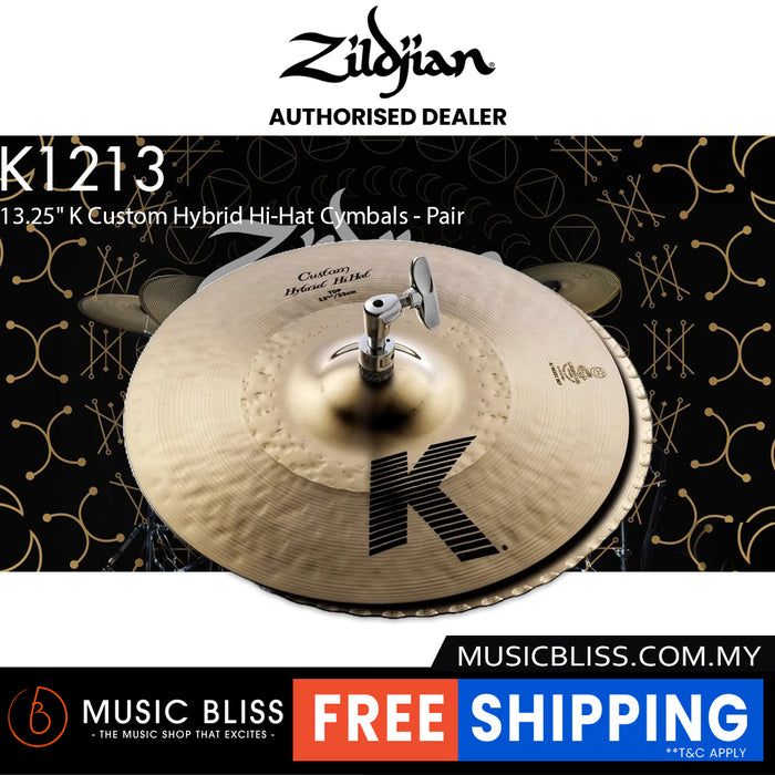 The Zildjian 13.25" K Custom Hybrid hi-hat cymbal pair provides great tonality and powerful sound while offering a high degree of control. This 13.25" hybrid hi-hat pair gives you the power of a 14" set with the control of a 13" pair. Ideal for both recording and live applications, the 13.25" K Custom Hybrid hi-hat pair features Mastersound "hybrid hammering on the bottom cymbal. Zildjian increased the surface area where the cymbals contact each other, resulting in a warmer "chick" sound from the 13.25" K Custom Hybrid hi-hat pair.