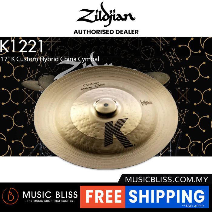 The Zildjian 17" K Custom Hybrid China walks the line between dark and brilliant, packing a ton of utility into a unique format. Music Bliss drummers just love this inspired creation of jazz-fusion drummer Akira Jimbo, because you can add it to any kit and instantly expand the range of rhythmic texture you can generate. Despite its thin weight, the K Custom Hybrid China's unlathed bell enables it to project like a heavier cymbal, delivering an explosive dark/mid sound with short sustain and excellent projection. It's eye-catching, too, with a traditional finish on the outer half and a brilliant finish inside.