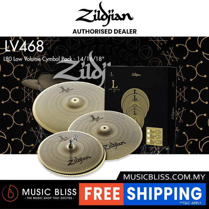 Zildjian L80 Low Volume cymbals are real cymbals that play at reduced volume - up to 80% less volume, thanks to a unique perforated pattern. That means you can play them exactly how you play any other cymbal, using any stick, mallet, or technique. The full decay is there, and they respond to your every playing nuance. Many Music Bliss drummers use L80 Low Volume cymbals with their acoustic kits for reduced volume in pit work or worship bands. And of course, they're the obvious solution for quiet rehearsals and late-night practice at home. Get real cymbal feel and sound at reduced volume, with L80 Low Volume cymbals.